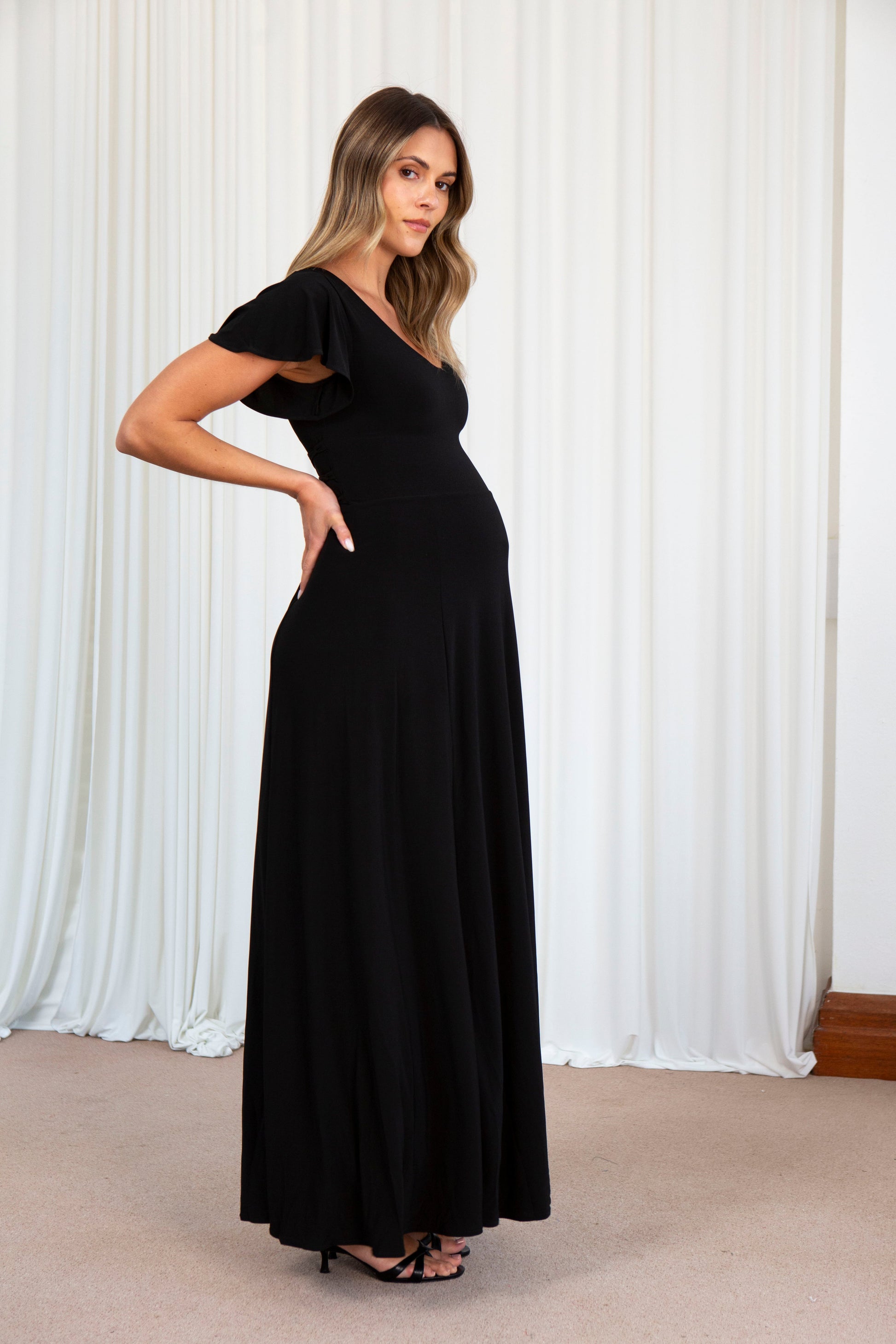 An exquisite maxi dress with flutter sleeves, a floaty skirt, and a corset-style lace-up waist for an adjustable fit. Ava promises an elegant, princess-like look. The double-layered fabric ensures complete protection from sheerness. Enjoy the perfect fit and superior comfort with this timeless piece.